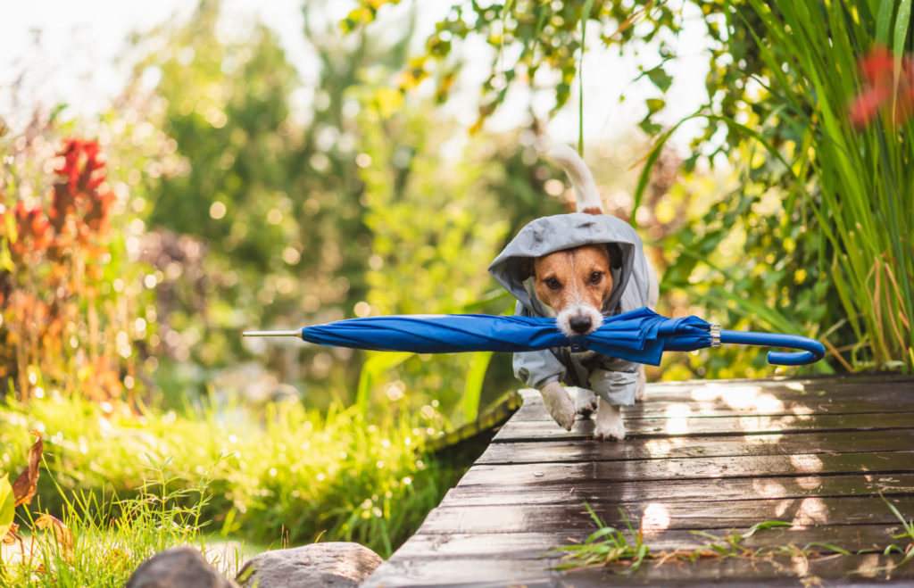 雨の日にできる水たまりには、ほかの犬や猫の排泄物が溶け出し、汚れがたまっていることがあります。その水を舐めたり手足の毛にしみ込んだりすると、雑菌やウイルスに感染する恐れもあるため注意が必要です。また、水に濡れながら長時間散歩すると肉球がふやけて傷が付きやすくなります。犬の皮膚は人間に比べて非常に薄く、傷ができると感染症や皮膚炎にかかりやすくなるので、防水カバーをつけたりこまめに肉球を拭いたりするなどしっかりケアしてあげましょう。毛が濡れたままにしておくと皮膚炎や嫌なニオイの原因になることもあるので、散歩後はしっかりタオルドライしたりレインコートを着せたりすることも大切です。